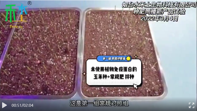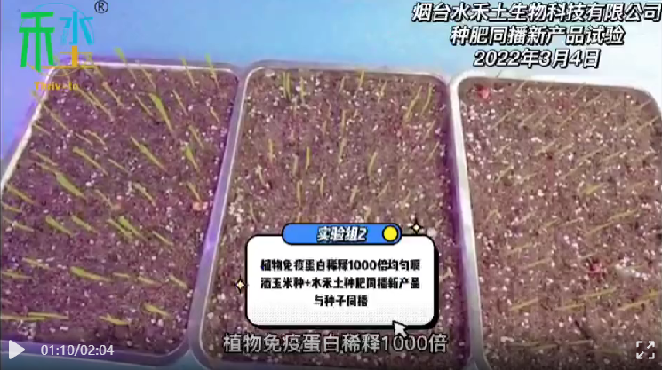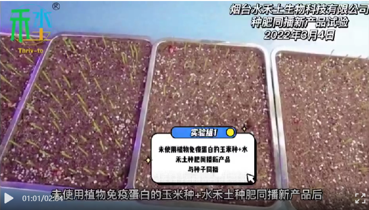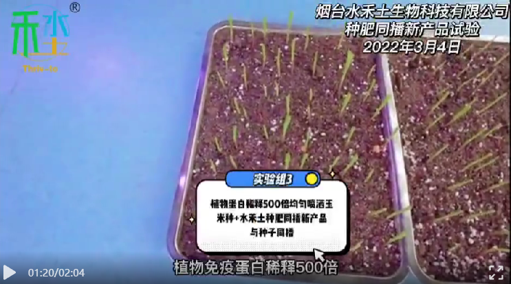 实验组2:水禾土植物免疫蛋白稀释1000倍均匀喷洒玉米种+水禾土种肥同播新产品后与种子同播;