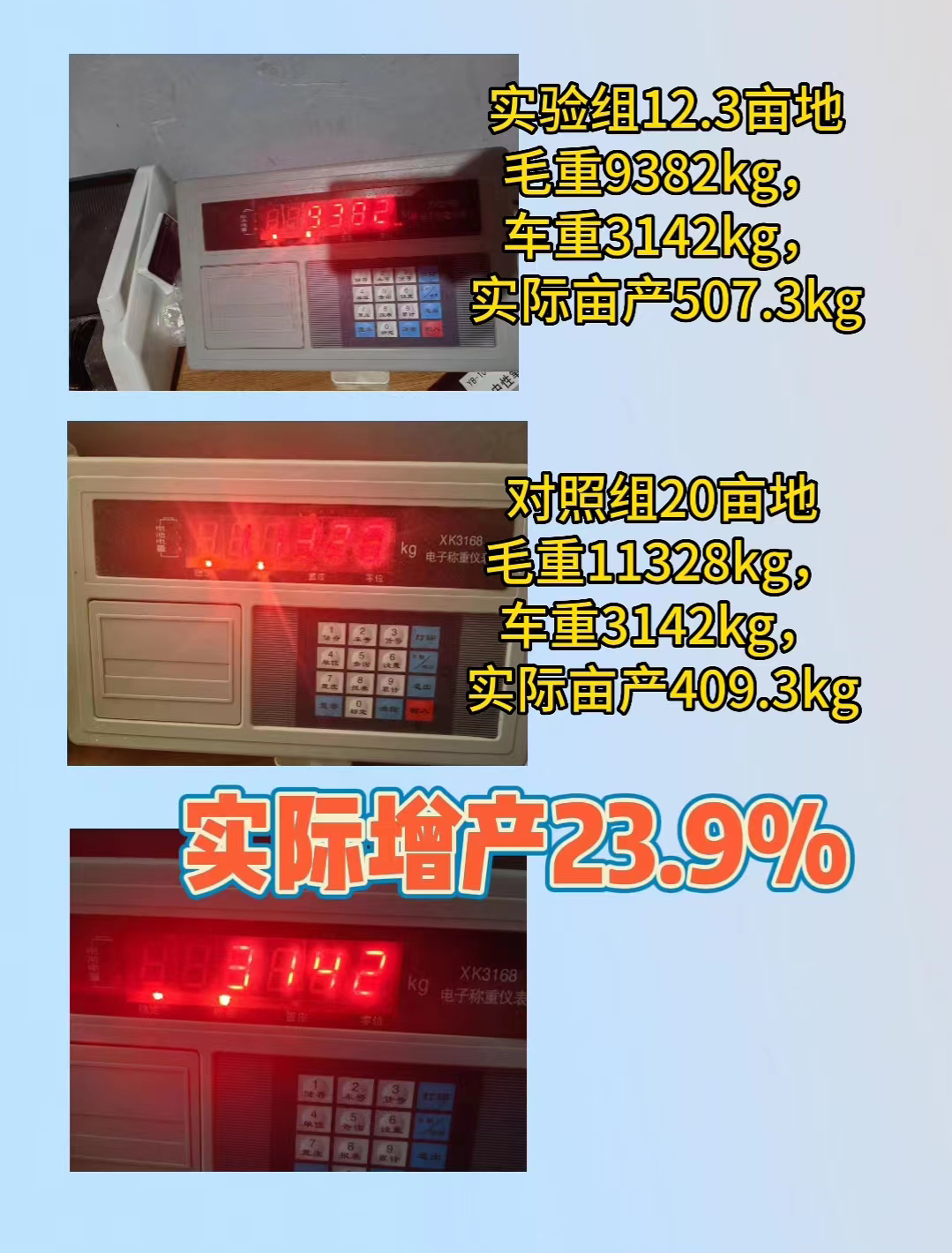 山东新阳光种业科研创新基地是一家专业育种基地,该基地的小麦在返青期扬花期各喷施了一遍水禾土植物免疫蛋白。5月27日,小麦成熟前期,我公司技术人员走进基地实地调查发现:喷施植物免疫蛋白的小麦穗大、籽粒饱满;6月中旬,小麦采收后,我公司技术人员再次来到该基地,基地负责人告诉我们:因土壤贫瘠,往年小麦亩产一般都在800多斤,但是今年喷施水禾土植物免疫蛋白的小麦平均亩产1014.6斤,对照田平均亩产818.6斤,每亩增产196斤增产23.9%