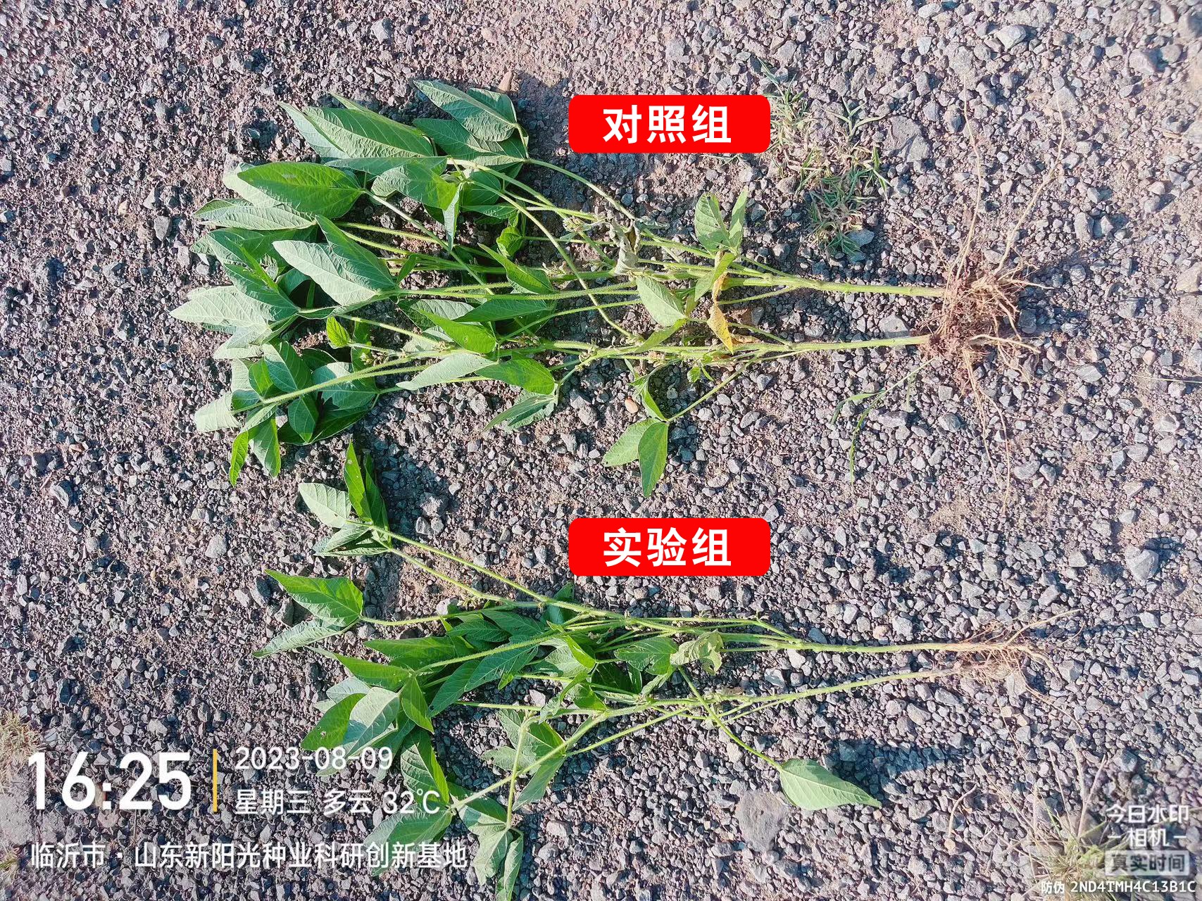 临沂市郯城县新阳光种业基地种植的大豆,在苗期和花前各喷施了一次水禾土植物免疫蛋白,与对照田相比,喷施植物免疫蛋白的大豆叶片厚绿、长势健壮,植株分枝多,茎杆粗壮,根系发达。