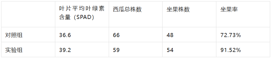 从上述数据可以看出:实验组西瓜叶片平均叶绿素含量比对照高7.1%,坐果率比对照高25.83%,且实验组西瓜的个头比较均匀,而对照组西瓜大小不均匀,个头差异很大。