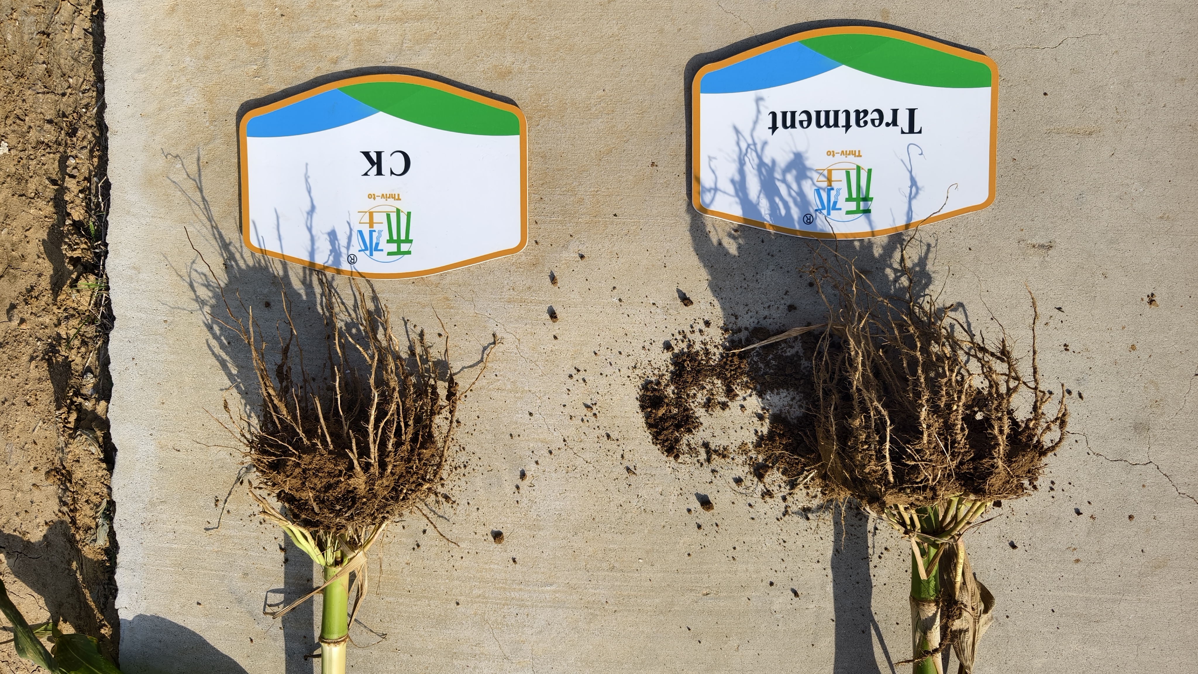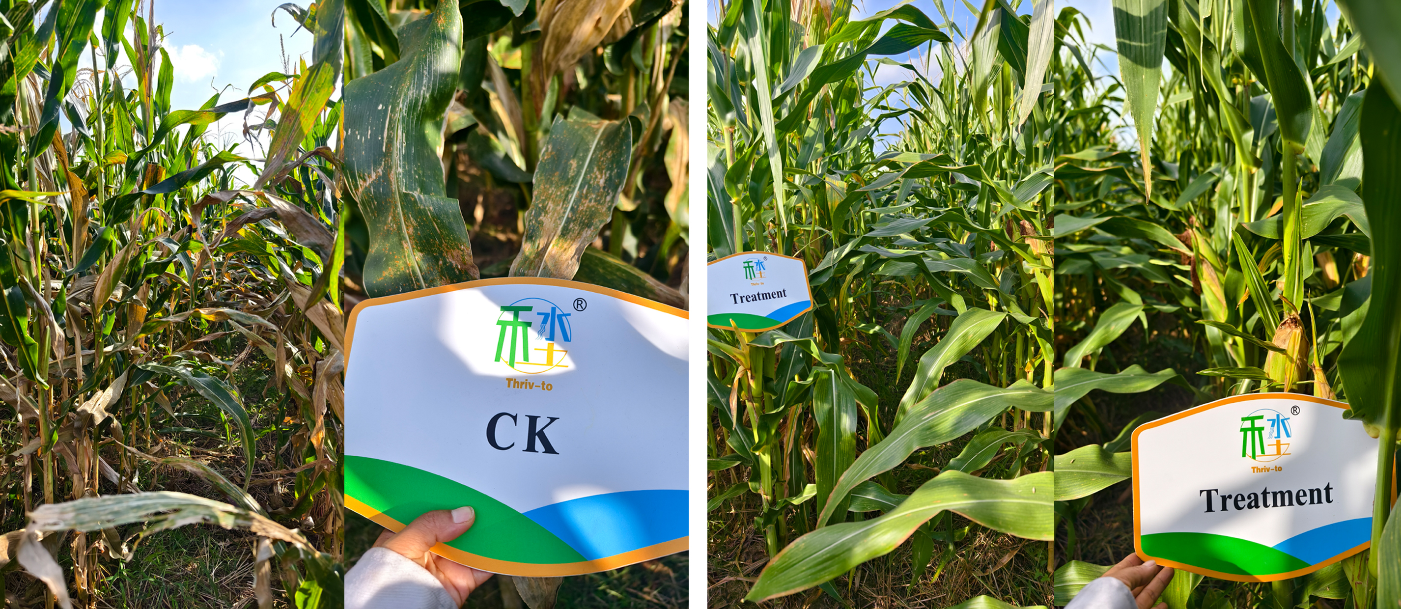玉米播种前,用水禾土植物免疫蛋白进行二次拌种。生长期(喇叭口期、吐丝授粉后)叶面喷施2次,飞防亩用量45ml/次,与杀菌杀虫剂一起喷施。使用后,玉米茎杆粗壮,锈病发生很轻,抗病能力增强,毛细根发达,扎根深,更利于养分吸收,且穗粒数比对照增加12.1%,结果穗位比对照低17.26%,有助于增强植株抗倒伏能力,叶片不早衰。