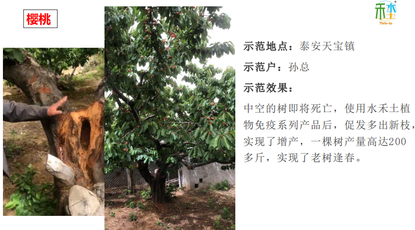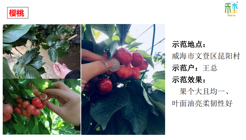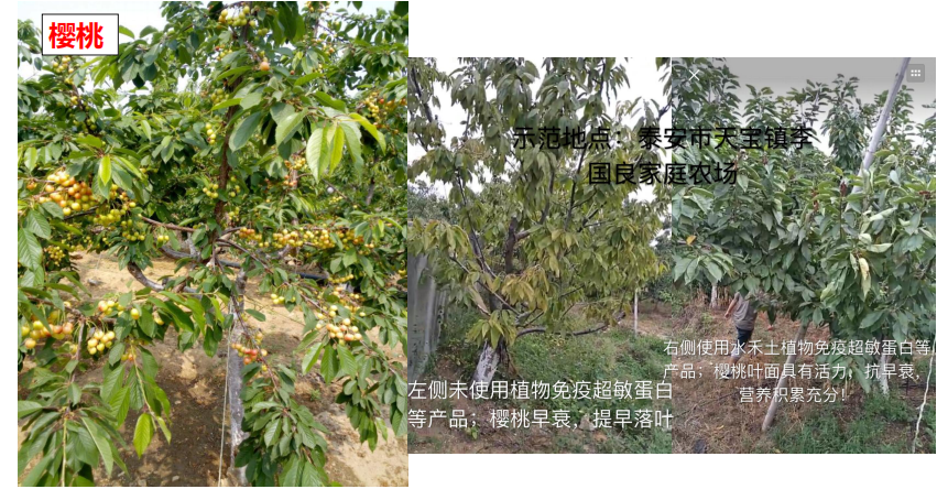 大樱桃谢花后、硬核-转色期喷施水禾土植物免疫蛋白,裂果轻、转色好。