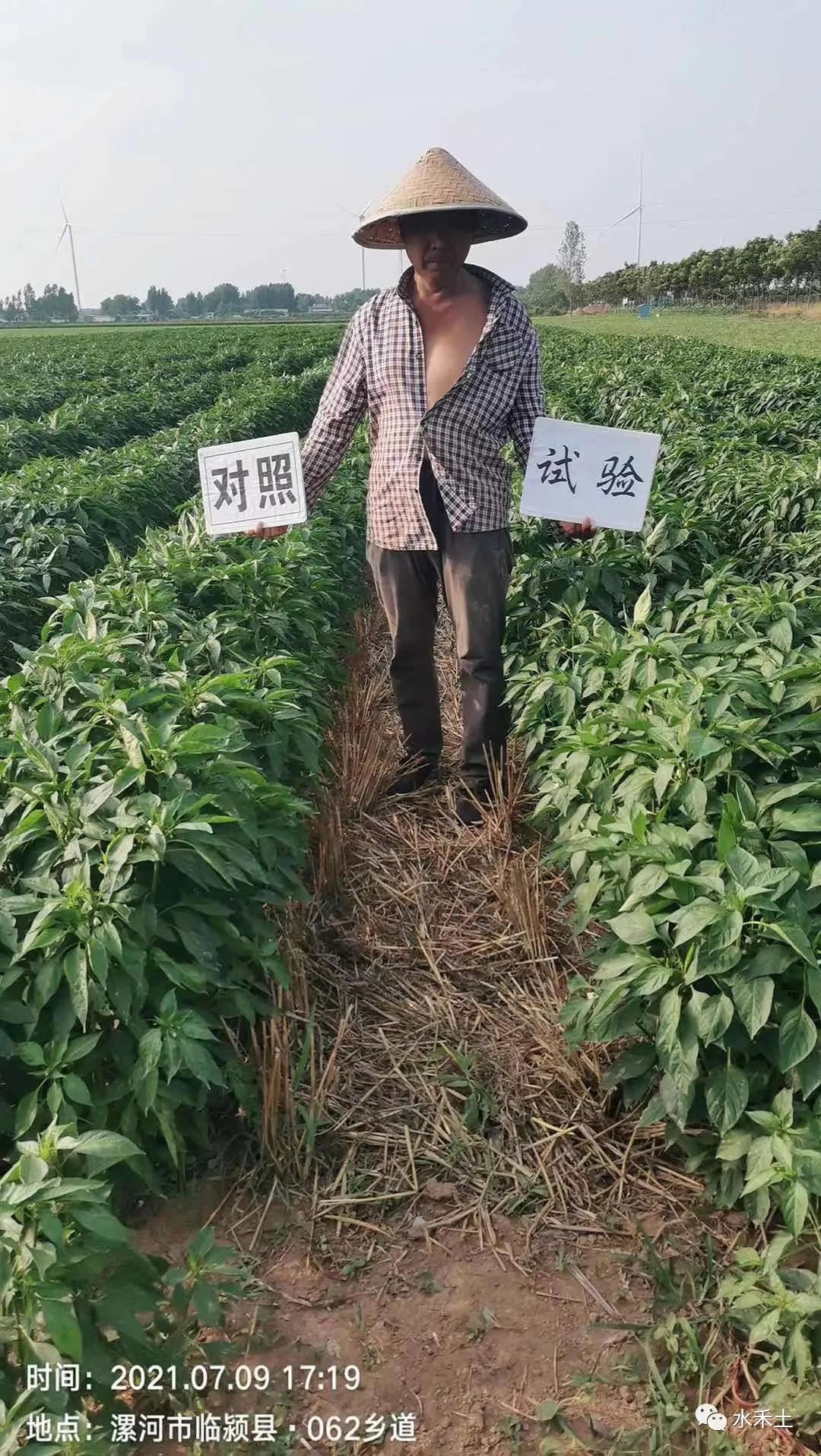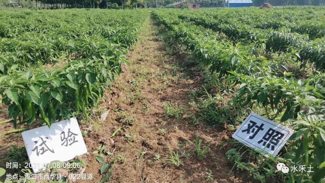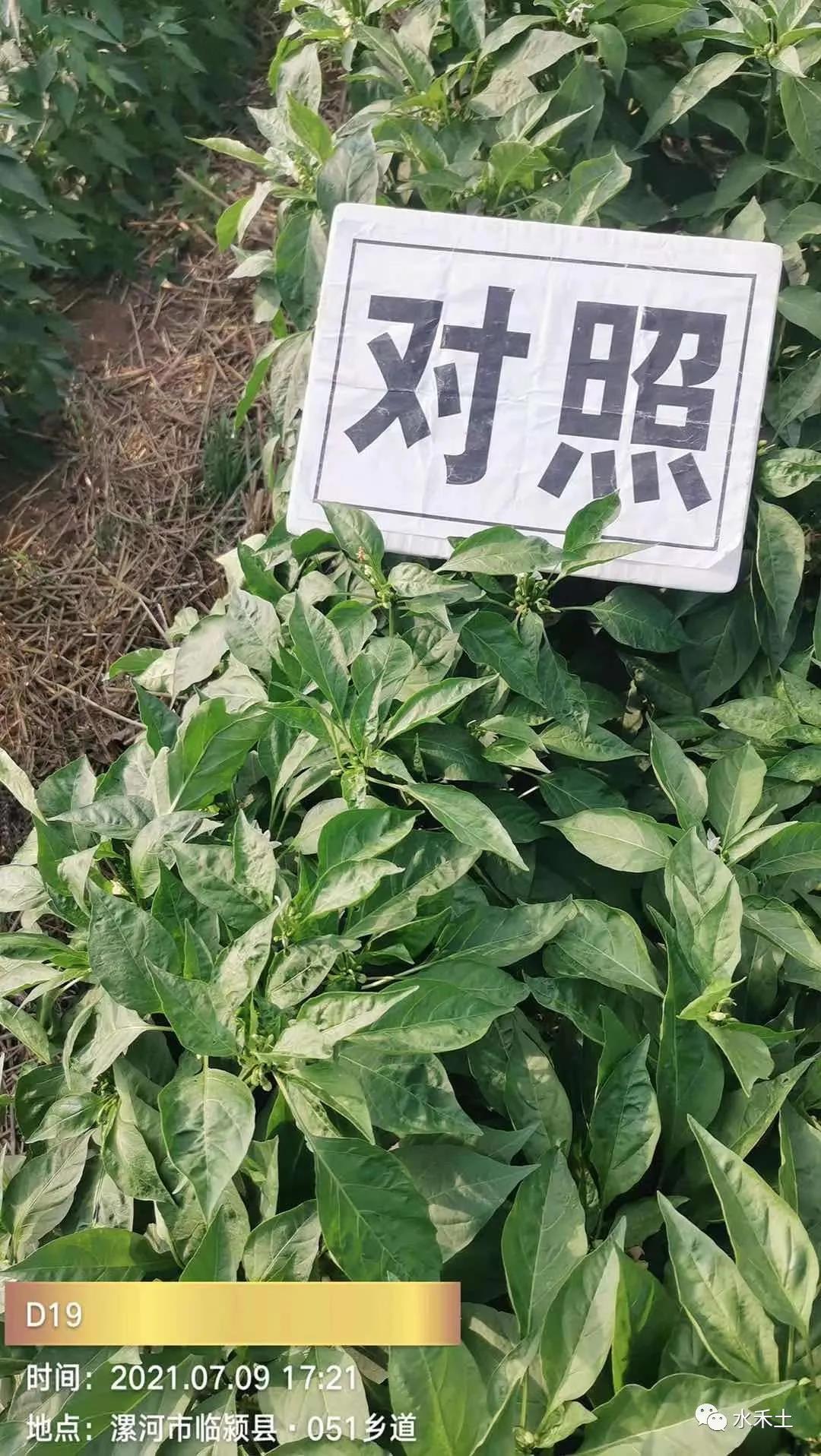 河南省漯河市临颍县的辣椒基地使用水禾土D19产品防治辣椒病毒病,试验组辣椒叶片平展,对照组辣椒叶片老叶皱缩畸形,新叶黄化退绿,水禾土D19早用早防!