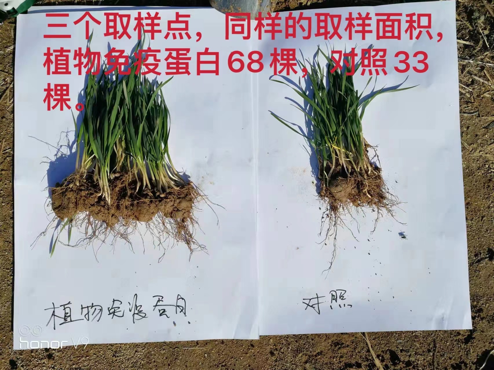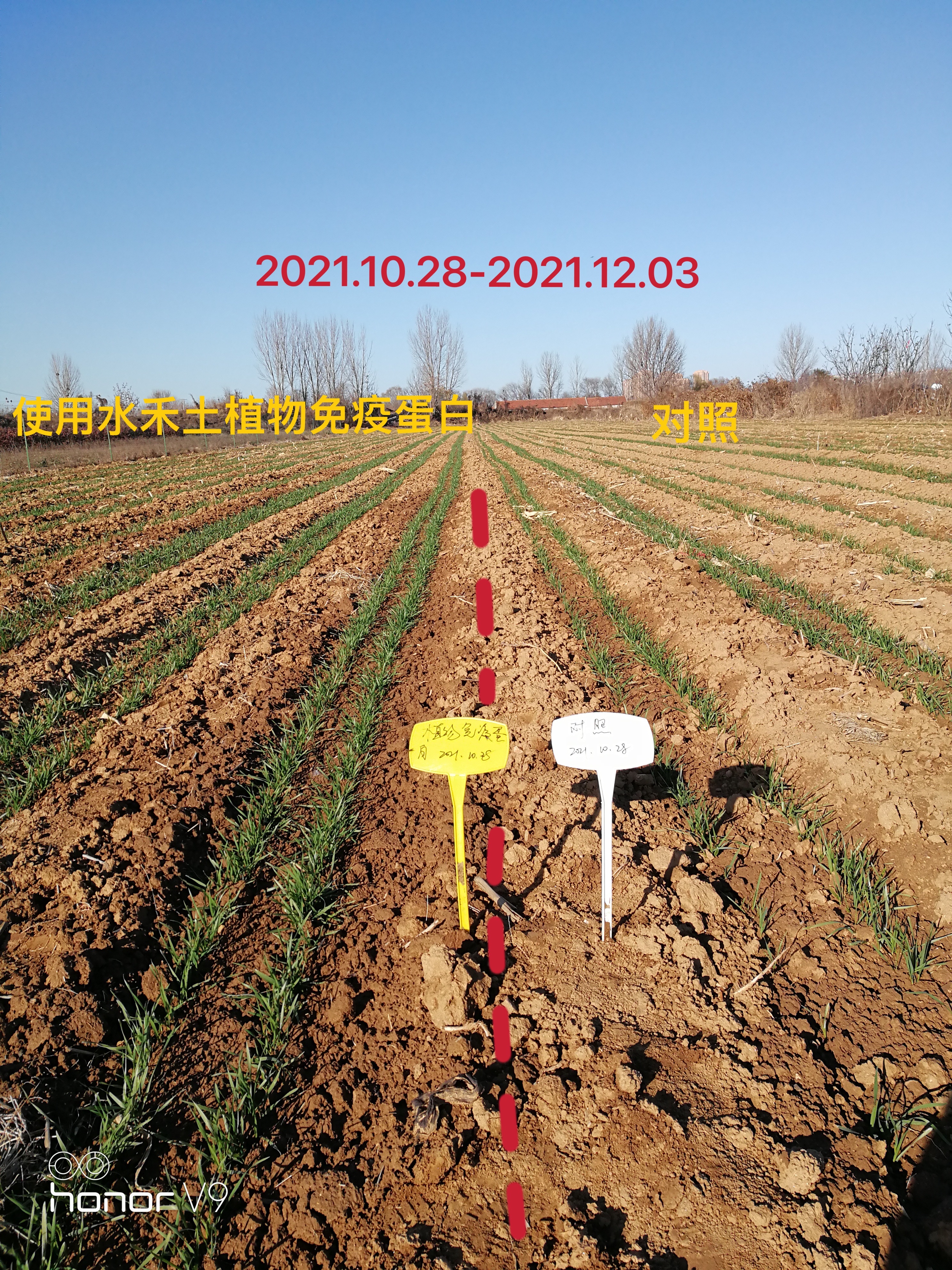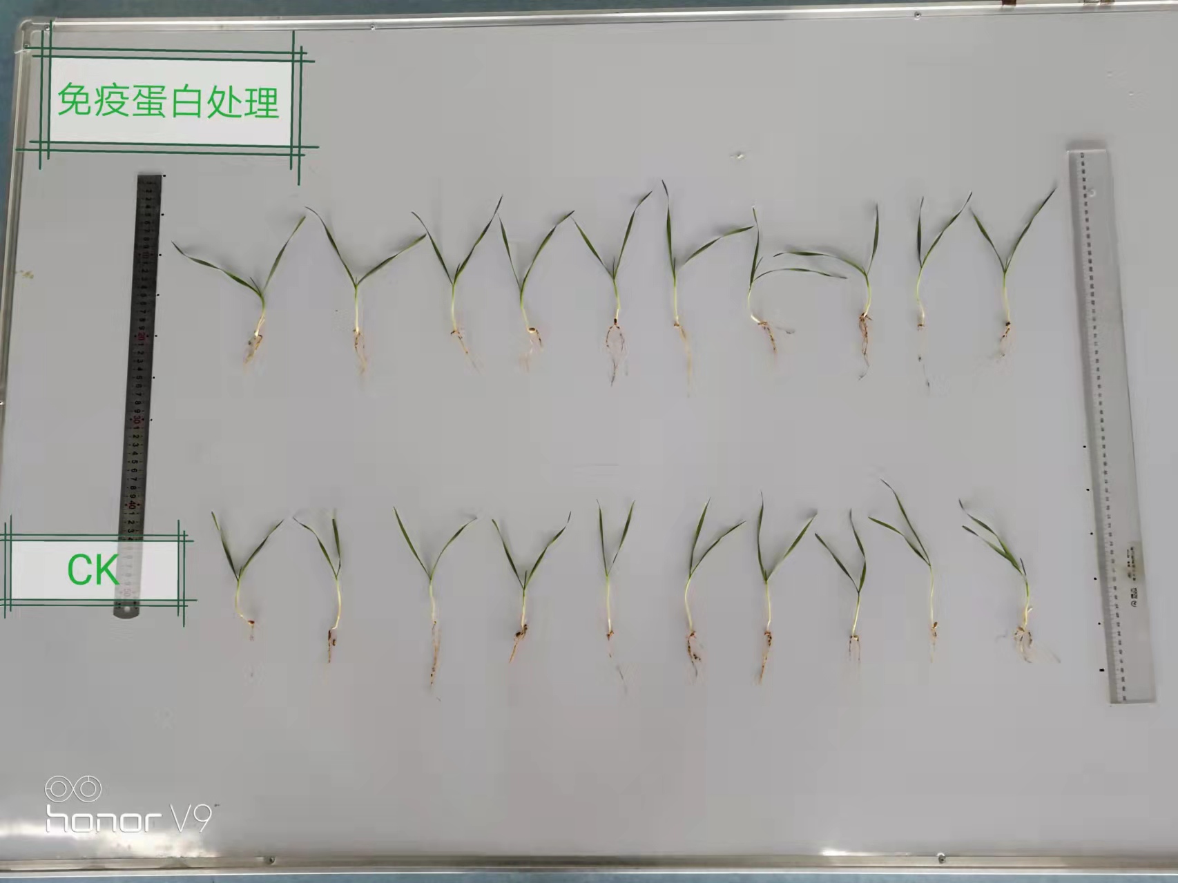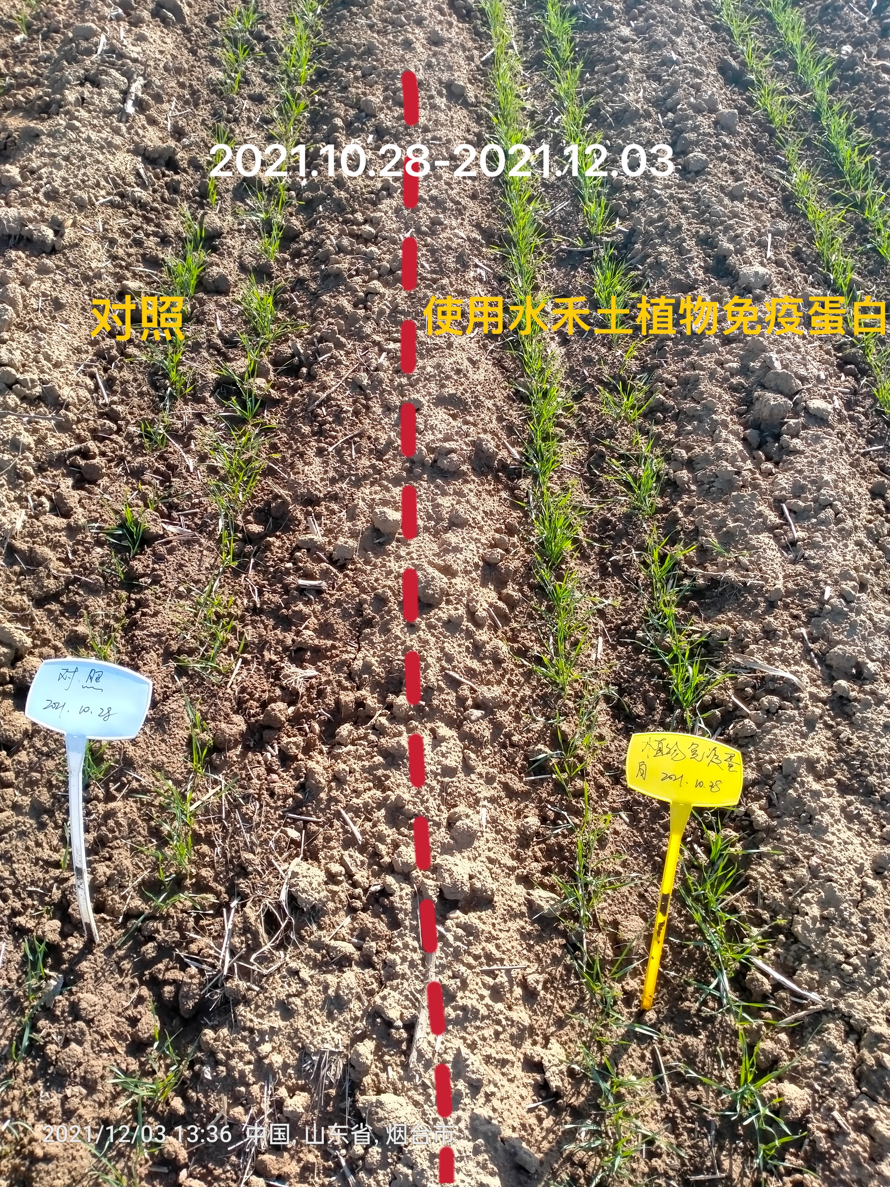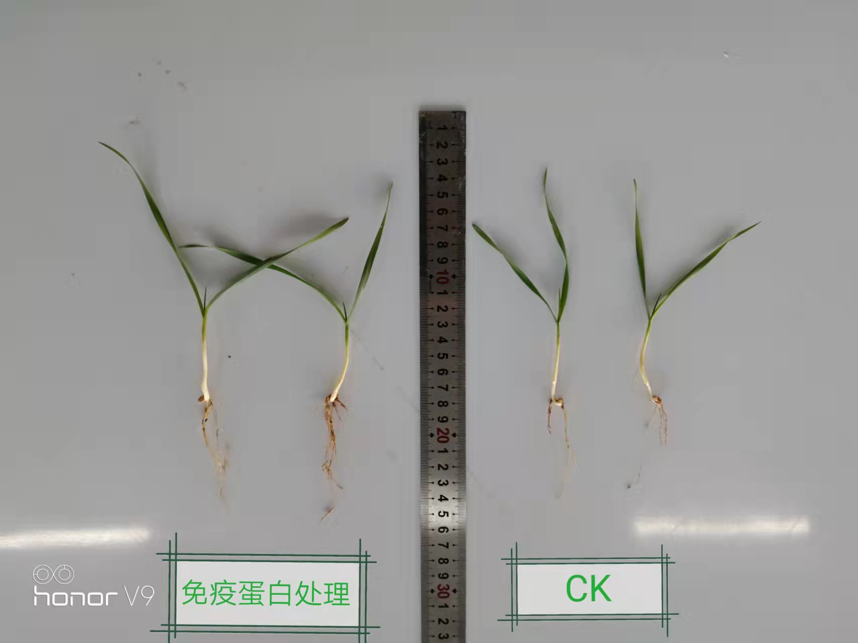 试验表明:水禾土植物免疫蛋白产品可促进小麦种子的萌发、提高出苗率,并可刺激小麦幼苗的生长发育,使幼苗健壮、根系发达。