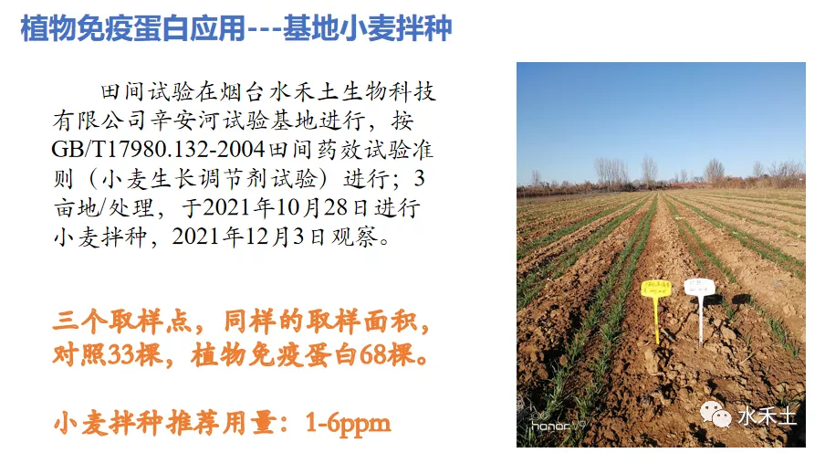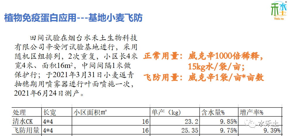 小麦使用水禾土植物免疫蛋白增产9.39%。