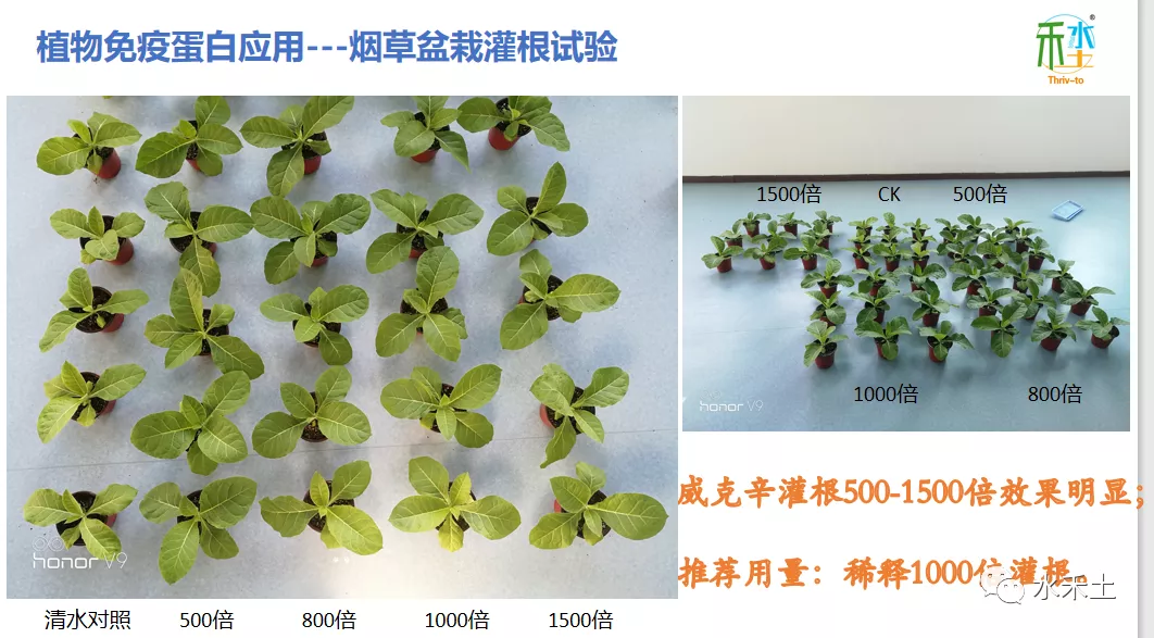 水禾土植物免疫蛋白灌根实验,与清水对照相比,使用植物免疫蛋白灌根的烟草植株更健壮、叶片颜色浓绿、叶片增大,光合作用增强。
